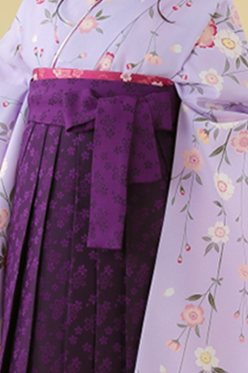 ノーブルな印象の淡パープル×濃紫コーデは優美なレディのために。桜柄の袴と合わせた刺繍衿で素敵にオシャレ度UP♪刺繍衿もセットだからお得!
