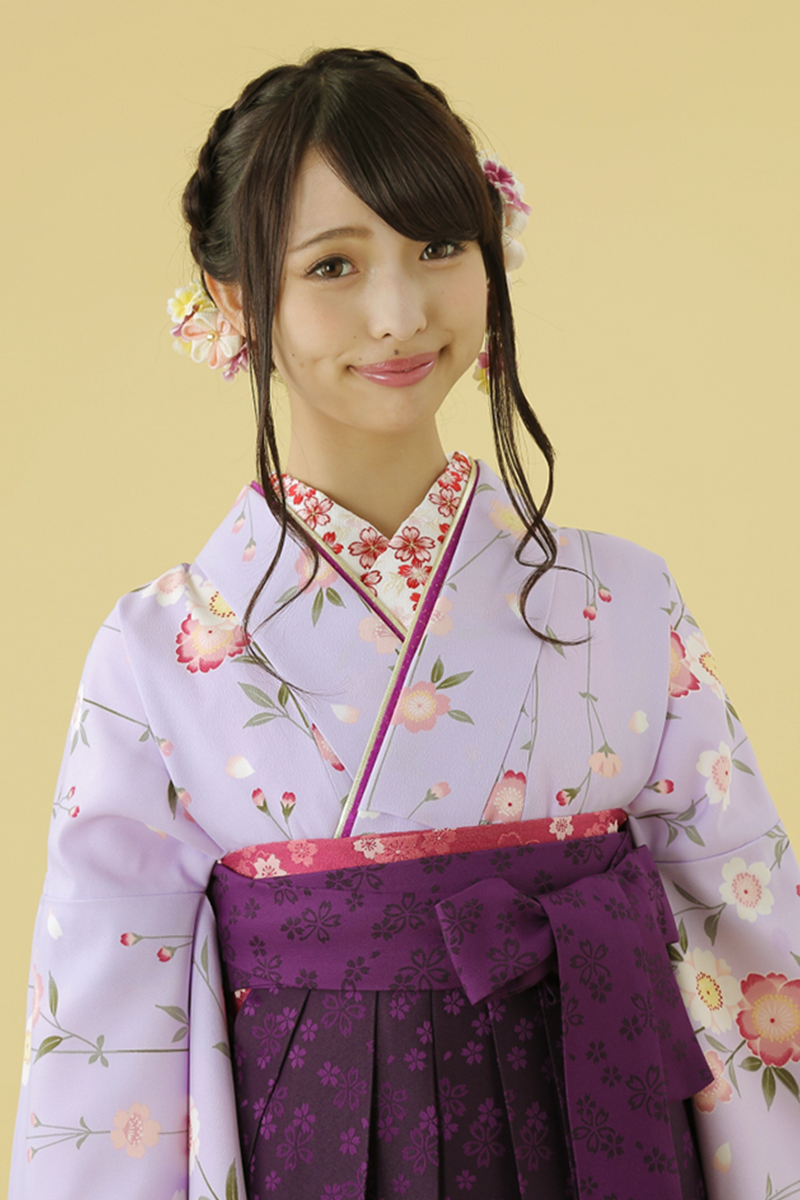 可愛くレトロな着こなしがとってもキュート。袴は桜の総柄も大人っぽく演出できる紫を合わせて、美人さんスタイルが完成!