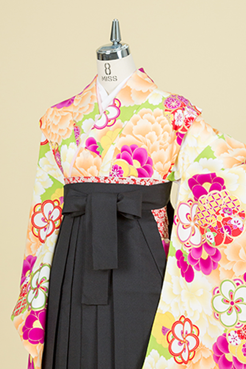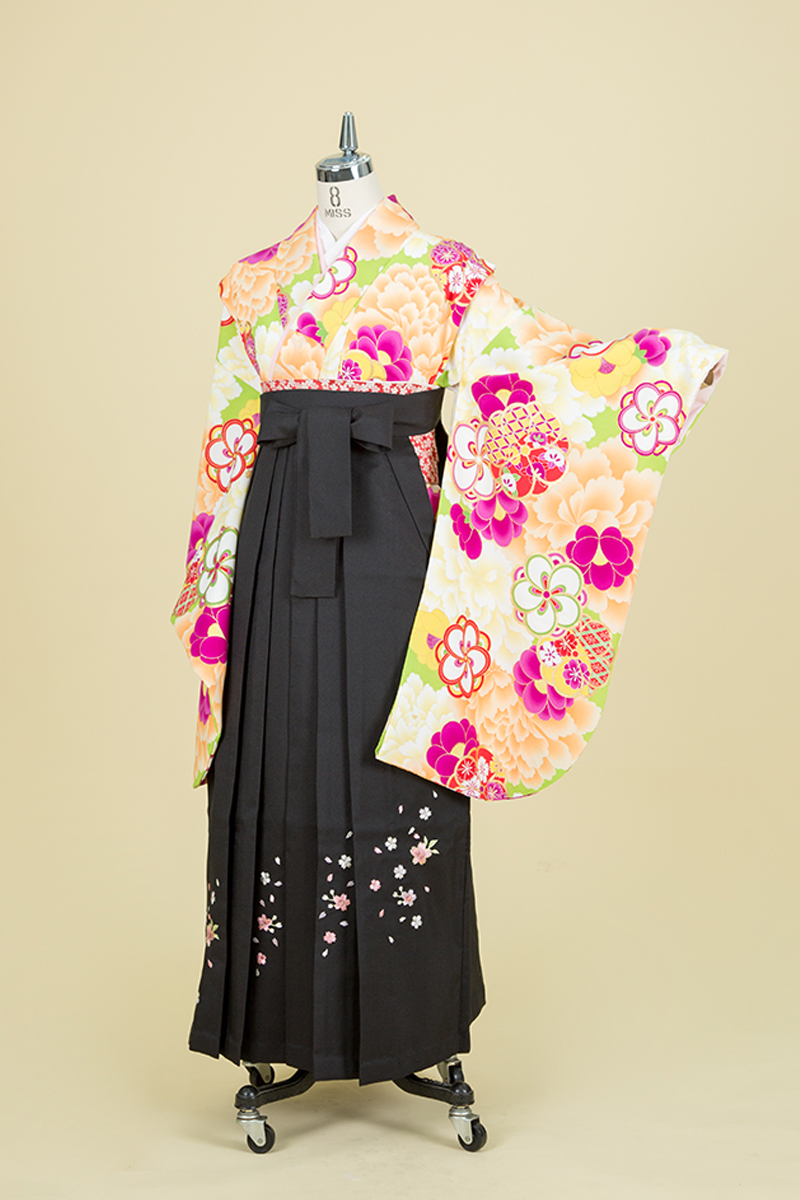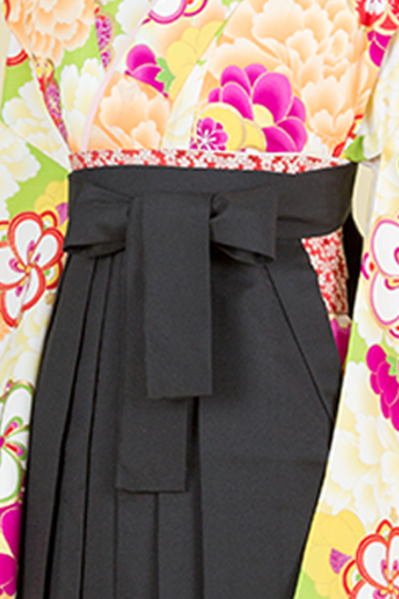 花々を大胆に描き、花々の豪華さが際立つ一枚。黒の袴スタイルで凜とした佇まいの完成!