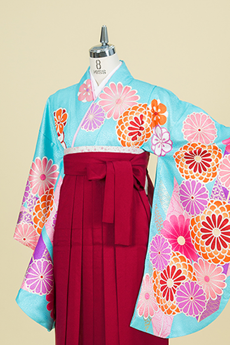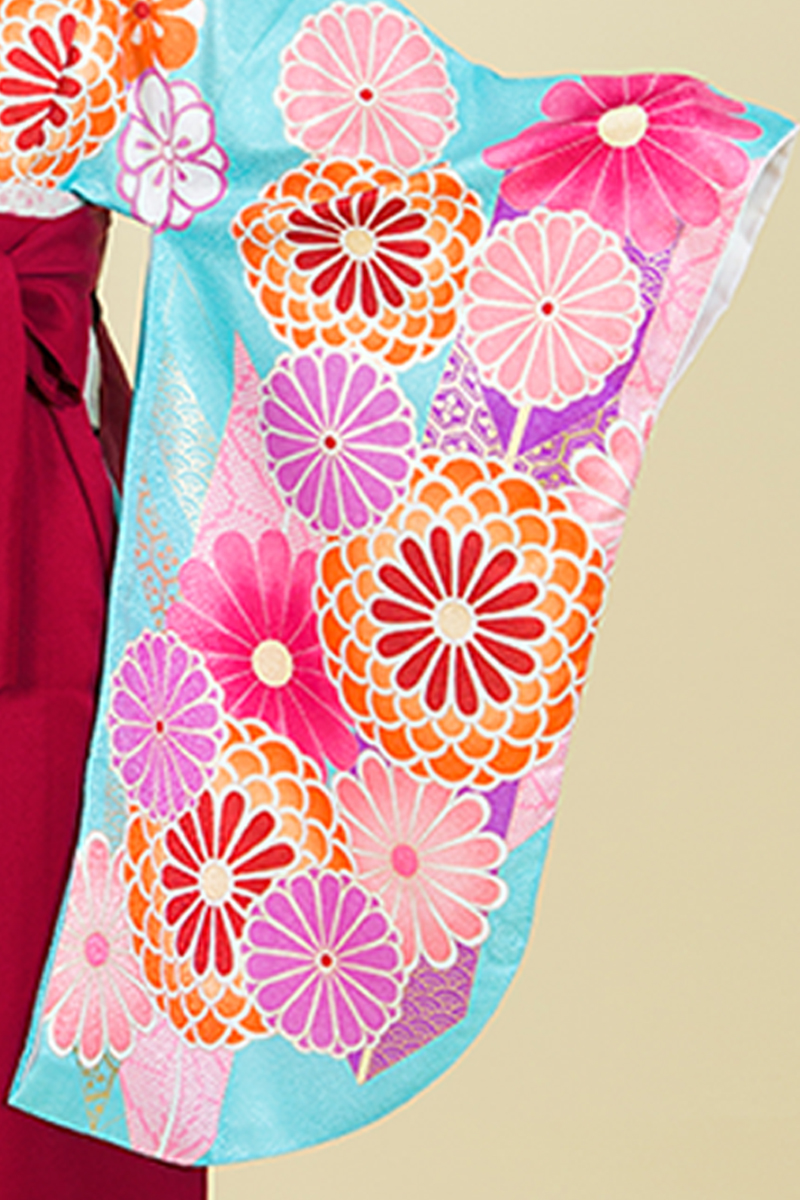 水色地に大輪の菊をあしらった、ビビットガールの完成。ピンク色の桜ただよう季節にピッタリの一枚です。