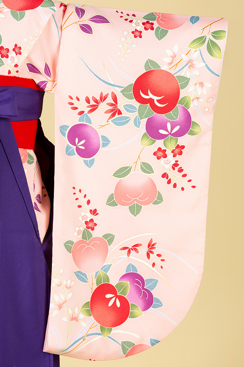 実のなるめでたい橘模様と芽吹きを表す若葉模様の古典スタイル。ベビーピンクが乙女の可憐さを引き立たせます。