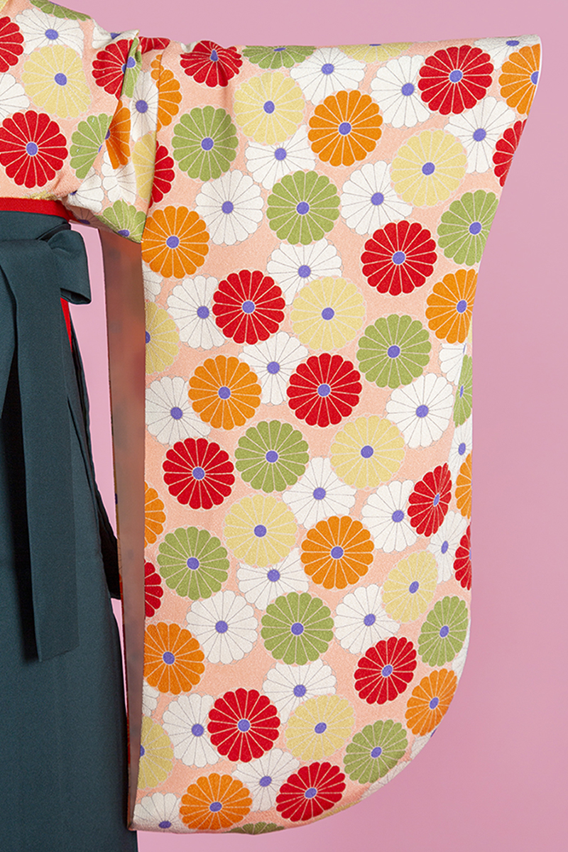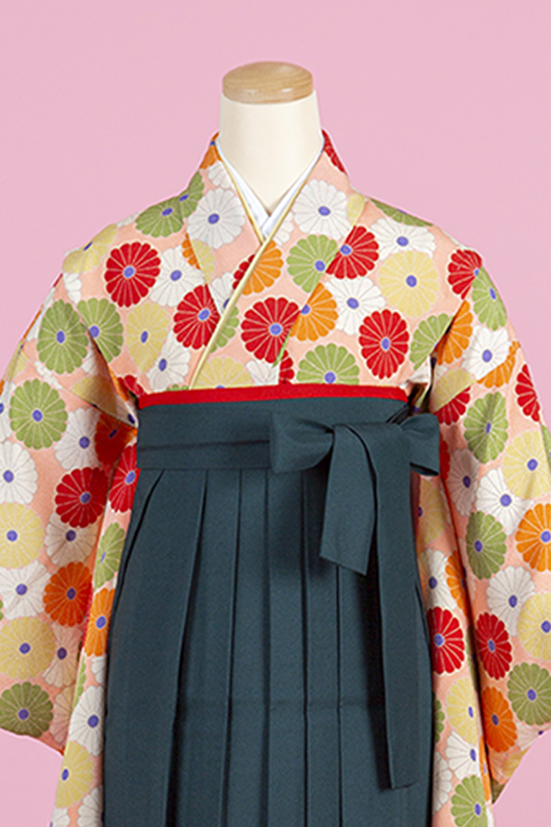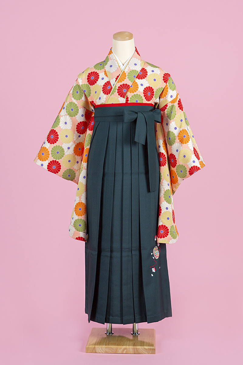 どこか懐かしいレトロ感漂う雰囲気の着物にグリーンの袴を合わせておしゃれガールの完成!ピンポンマムが華やかさを演出します。【※注意※】着物(二尺振袖)の地色はピンクベージュとなっております。