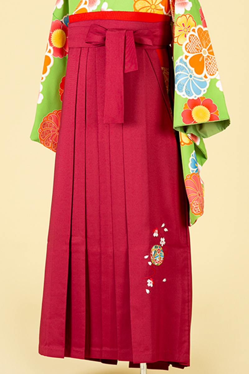 若葉色の地色に花々が散りばめられ、晴れの日にピッタリな一枚。エンジ色の袴で元気に着こなしちゃおう。