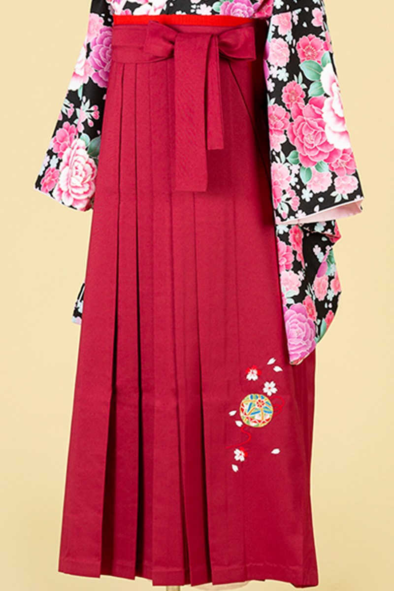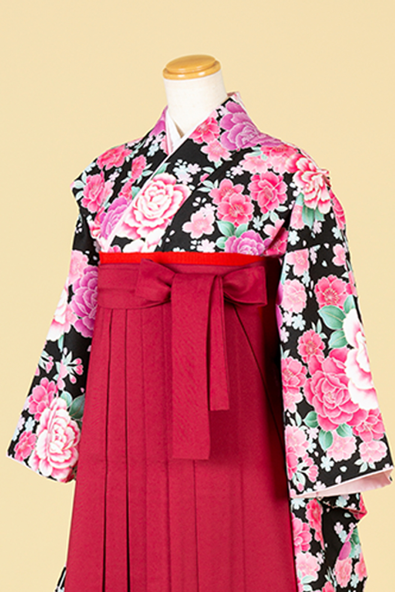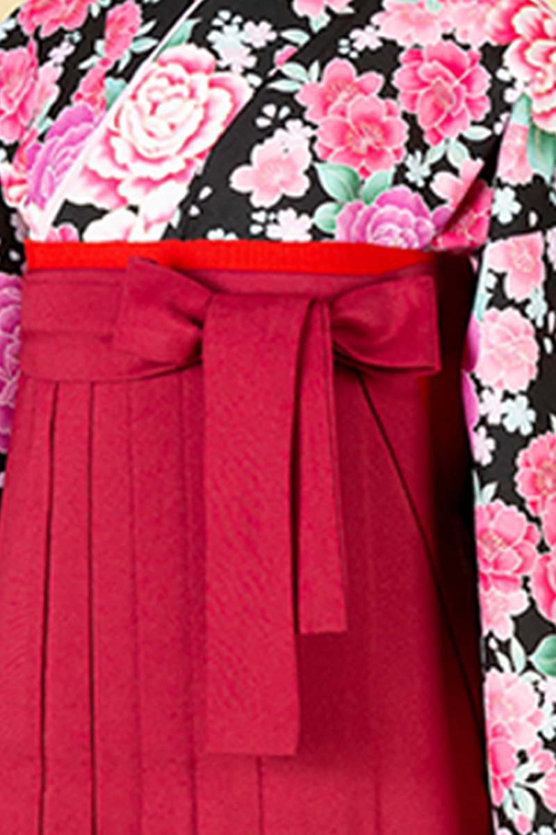 黒の洋風スタイルの袴。黒地にピンクの花が華やかさを際立たせます。