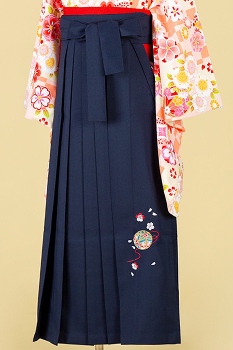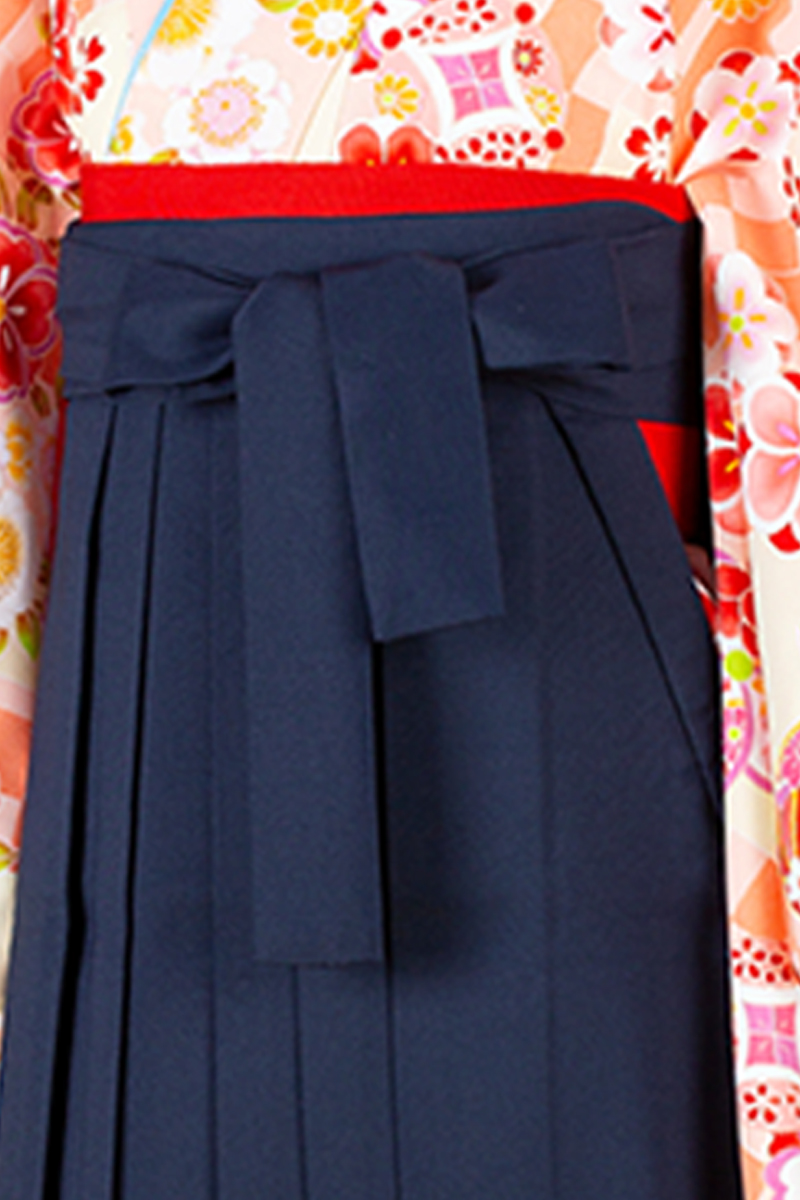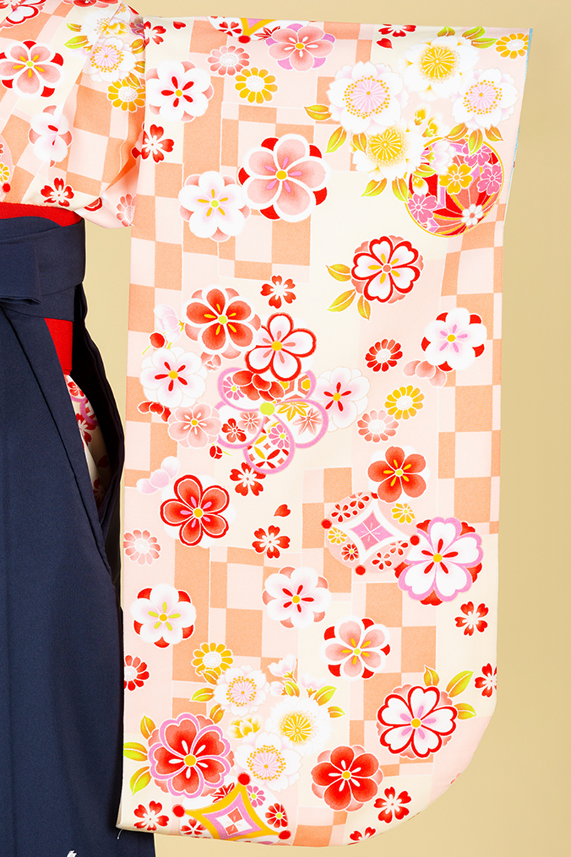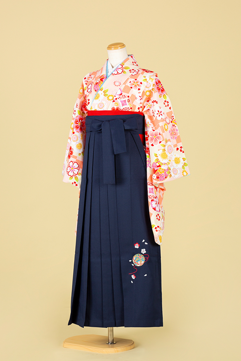 元気なオレンジの地色に花々は散りばめられ、とびきりキュートなスタイルに。清楚さの紺色袴でキリット引き締め、思い出の1日を楽しんじゃおう♪