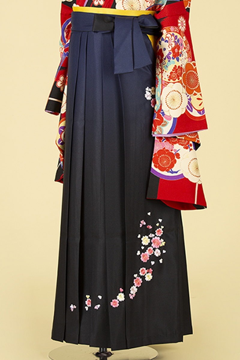 振袖の鮮やかなピンクと水色に、優しいピンク色の袴が合わさって女の子らしさ全開!振袖には縁起の良い花々がたっぷりと描かれていて、門出にぴったりの袴スタイルです!