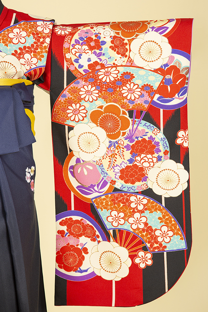 赤と黒のコントラストが大胆な矢羽根柄に扇や丸紋などの古典柄を配したモダンなスタイル。斬新なデザインに視線独占間違いなし!