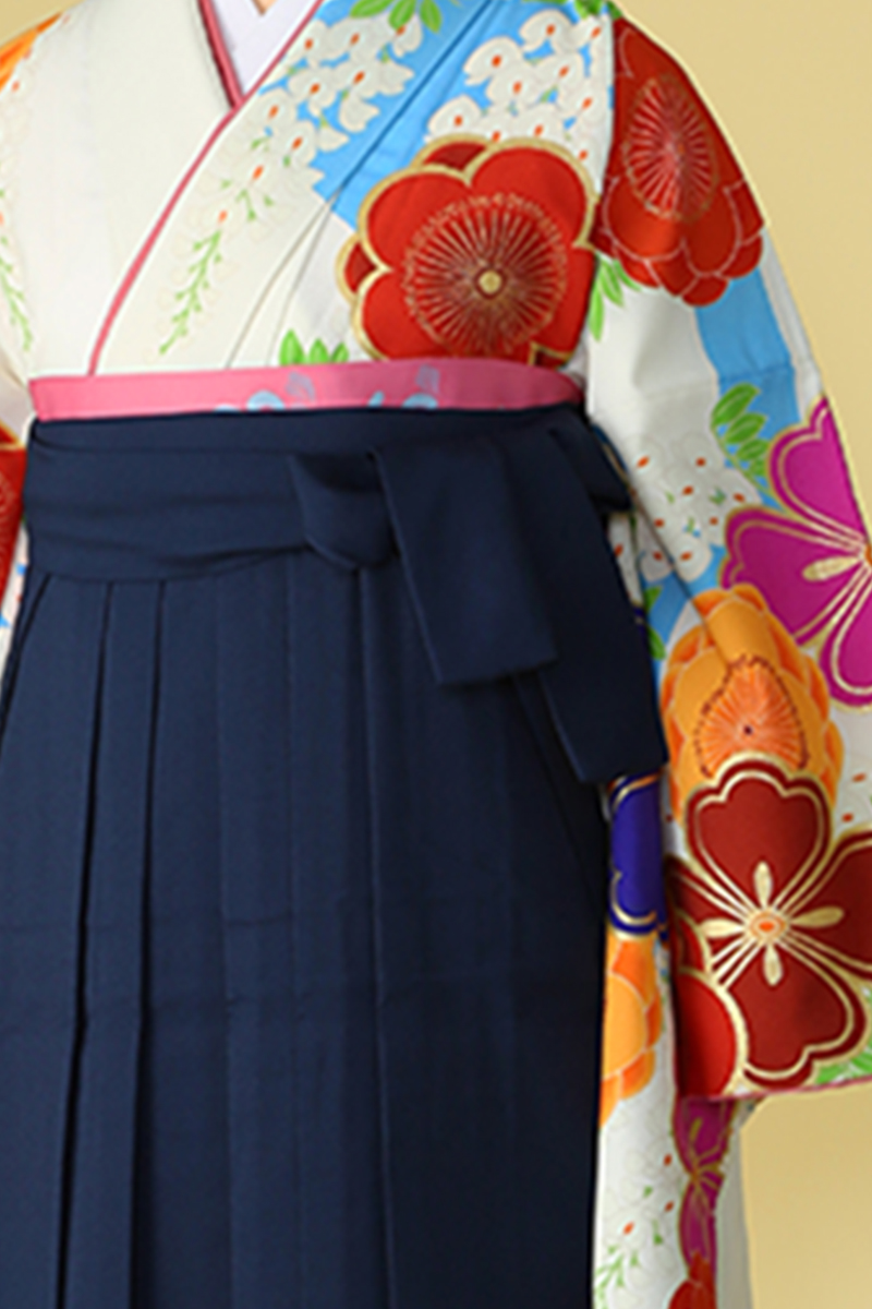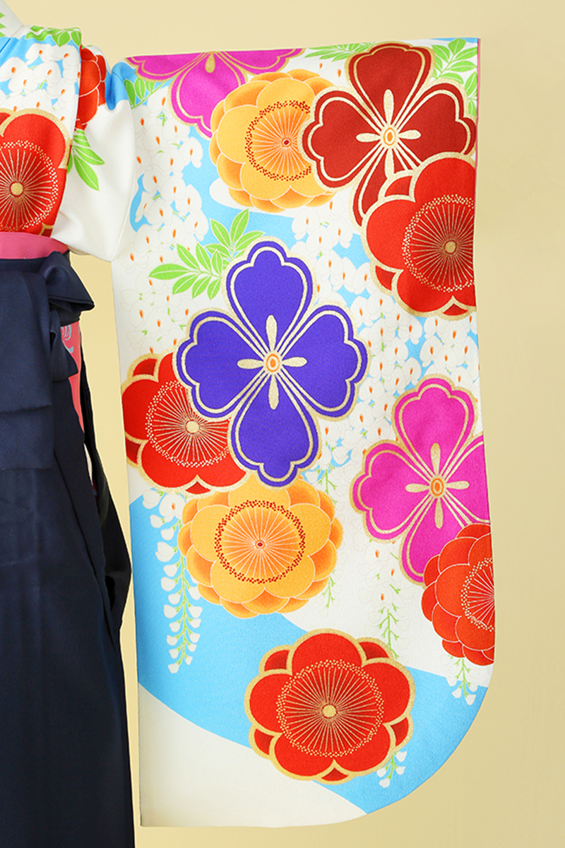 白地にビビットな花々のメリハリがインパクト大!紺地の袴で引き締めて。チラッと見えるピンクの帯がオシャレ度アップの鍵!