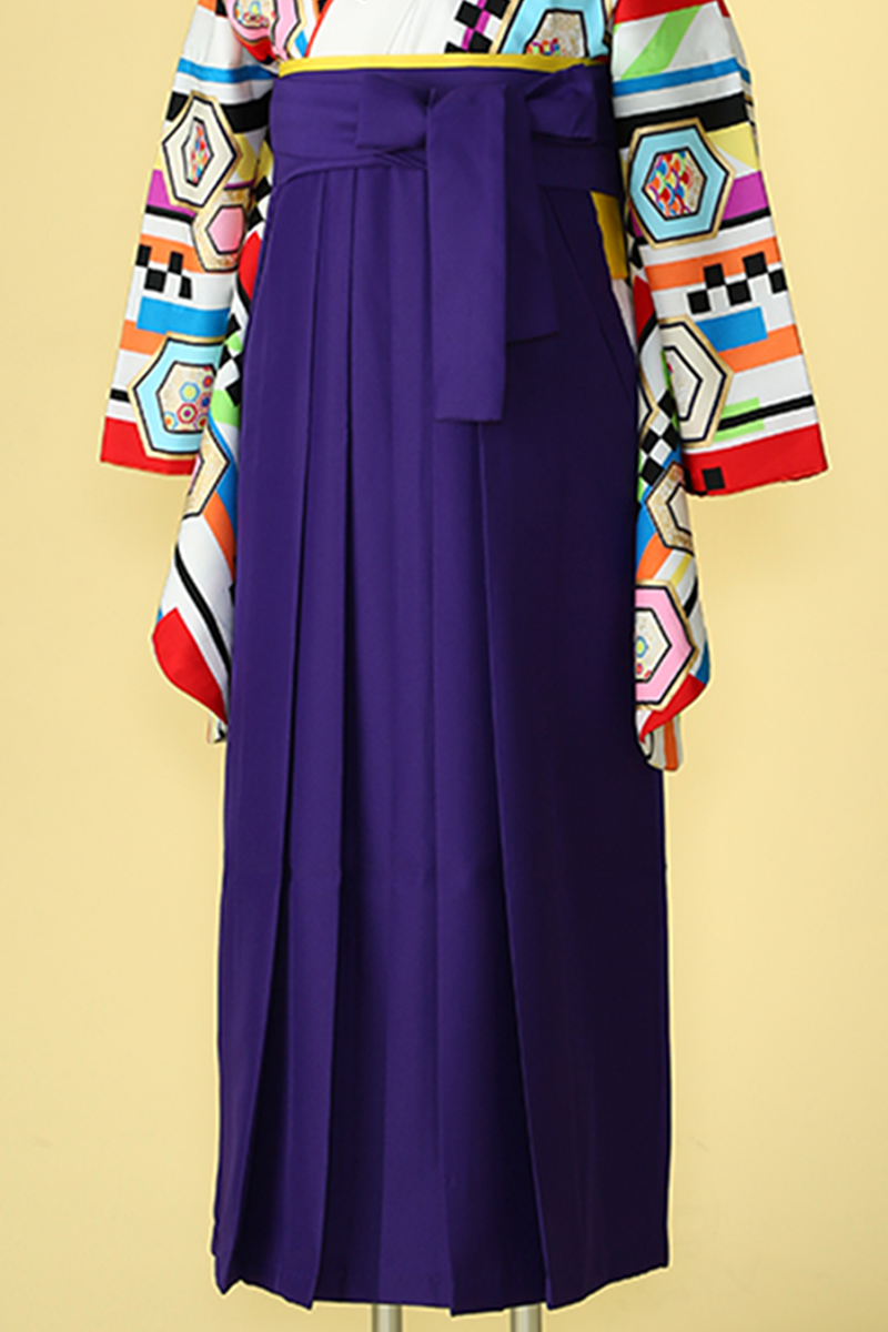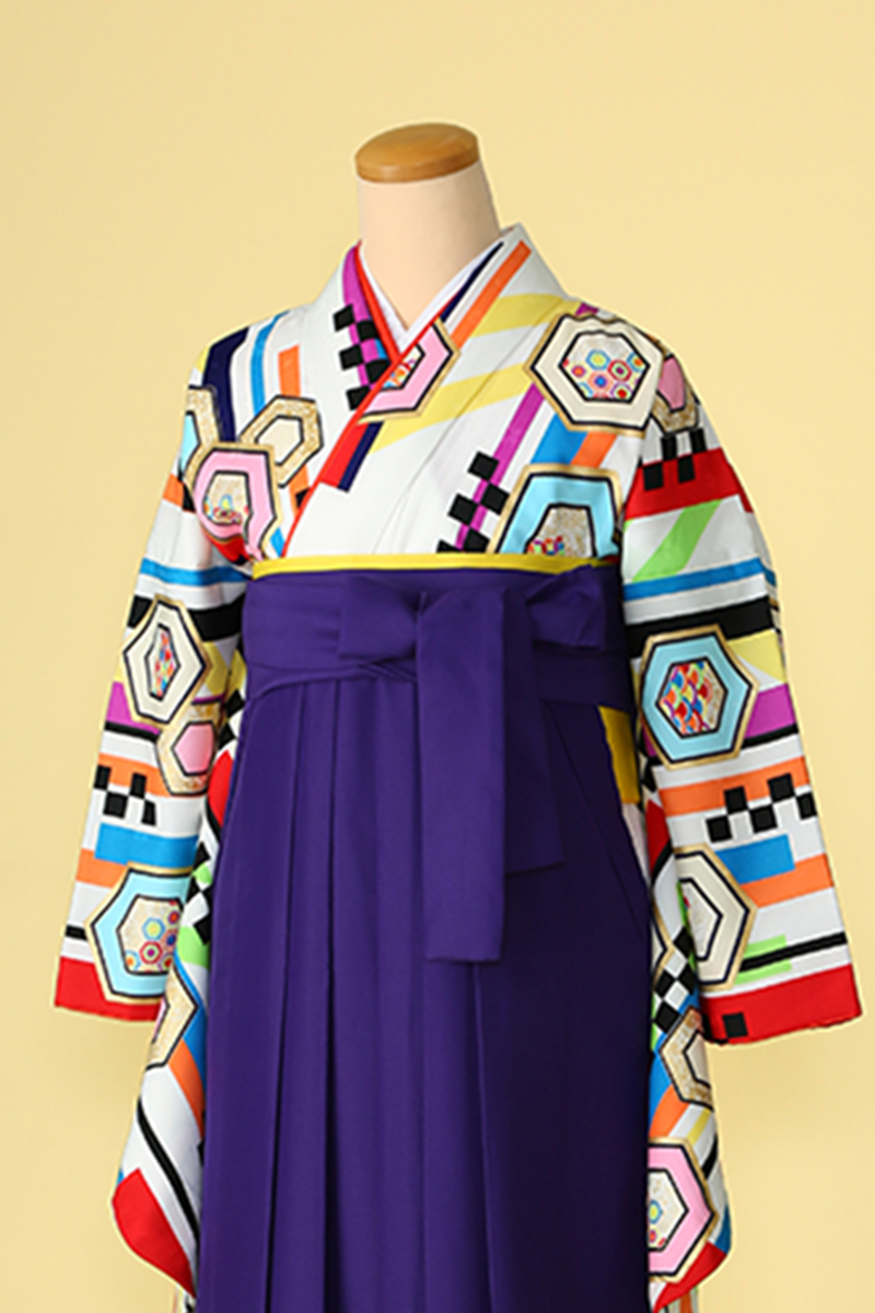 白地に鮮やかな柄付けが印象的なレトロモダンスタイルの袴です。ストライプ状に描かれた亀甲や市松模様はよりポップなカラーリングでイマドキなデザインとなっています。