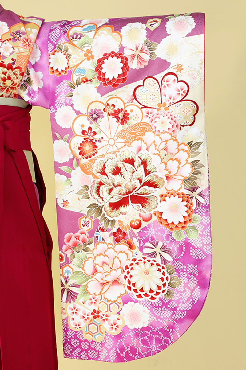 色味を抑えた紫の着物に牡丹や菊・桜・手毬・描き疋田などの古典文様が豪華な印象。大切な門出に相応しい一着です。