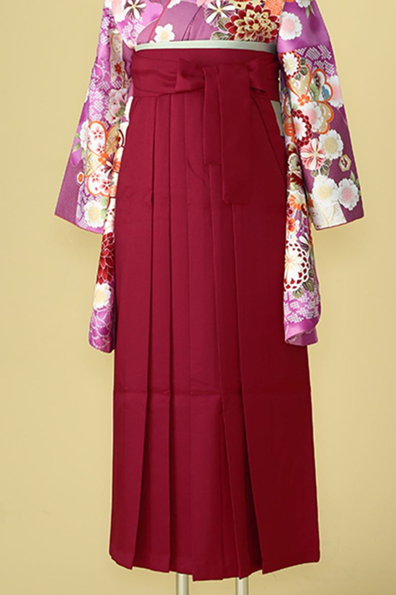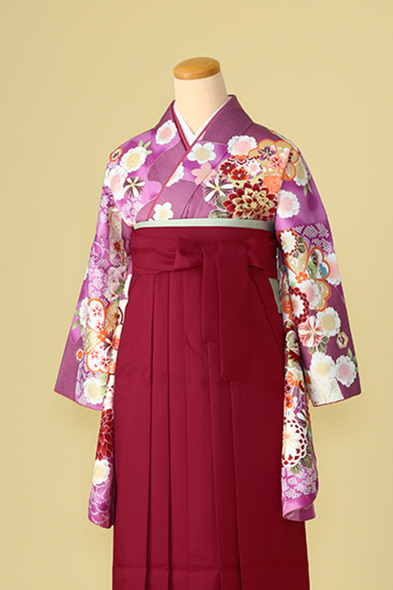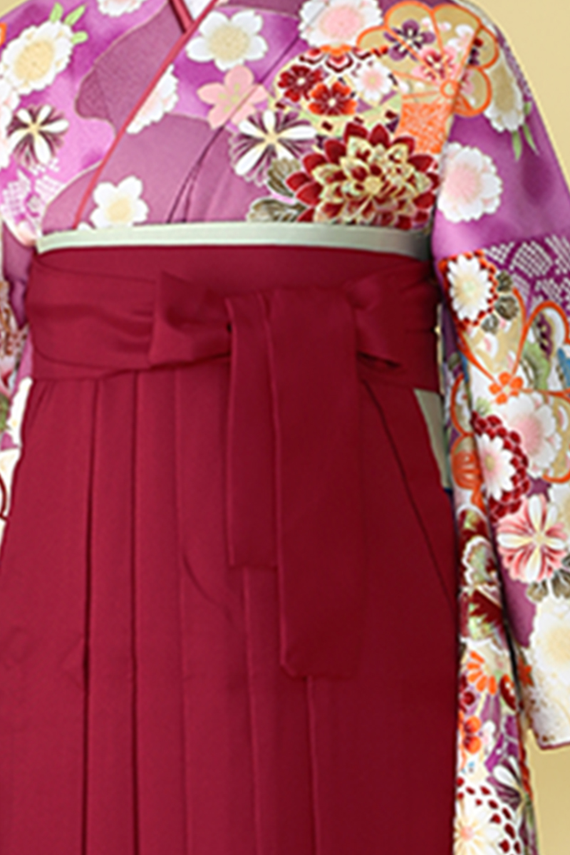 落ち着いた紫色の振袖に古典柄がたっぷりと描かれた華やかなスタイルです。振袖の柄付けが豪華な分、袴はスッキリと無地の臙脂色でキュッと引き締まったコーディネートになっています。