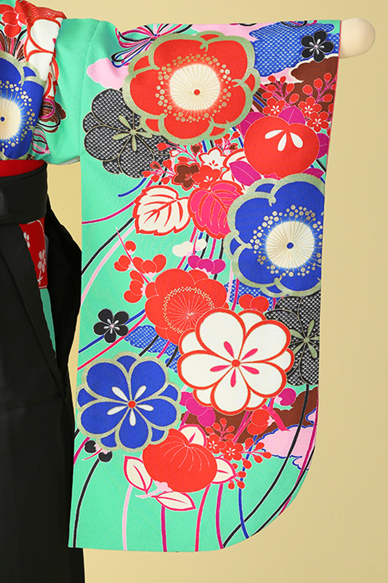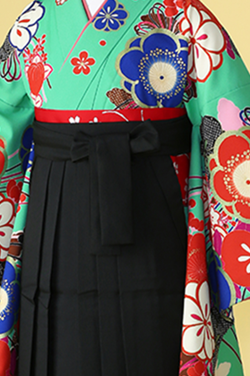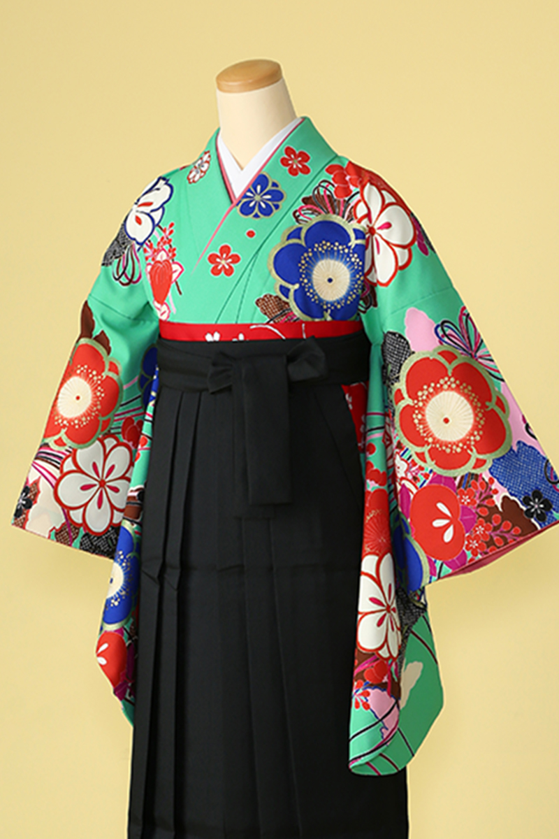 エメラルドグリーンの振袖に赤・青のハッキリとした色合いで柄が描かれているのが特徴的な袴です。振袖の色味と柄の色味が引き立て合ってポップでイマドキな印象に。流行に敏感な女の子にオススメの一点です。