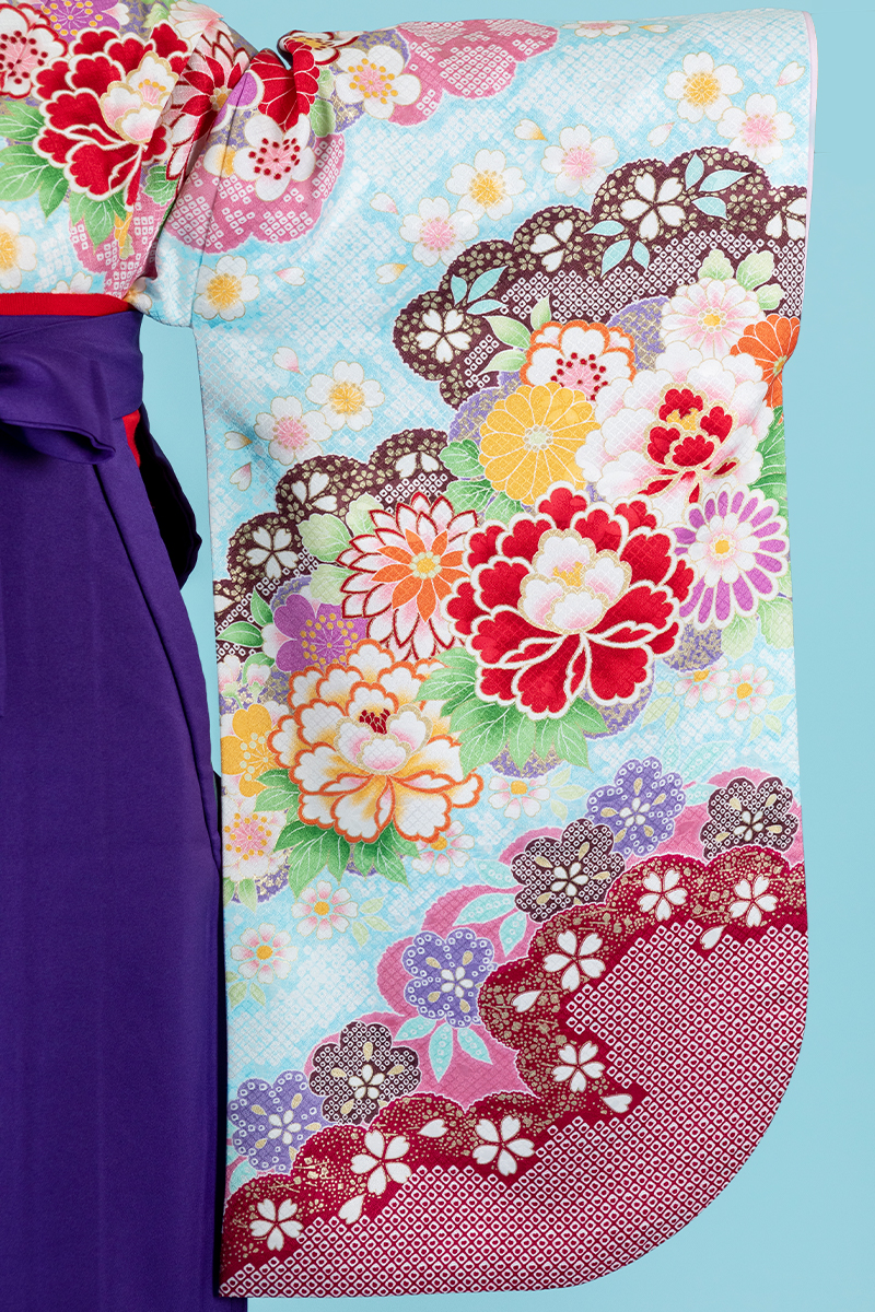 愛らしい疋田絞りの袴です。上品な水色がクラシカルな表情をのぞかせます。