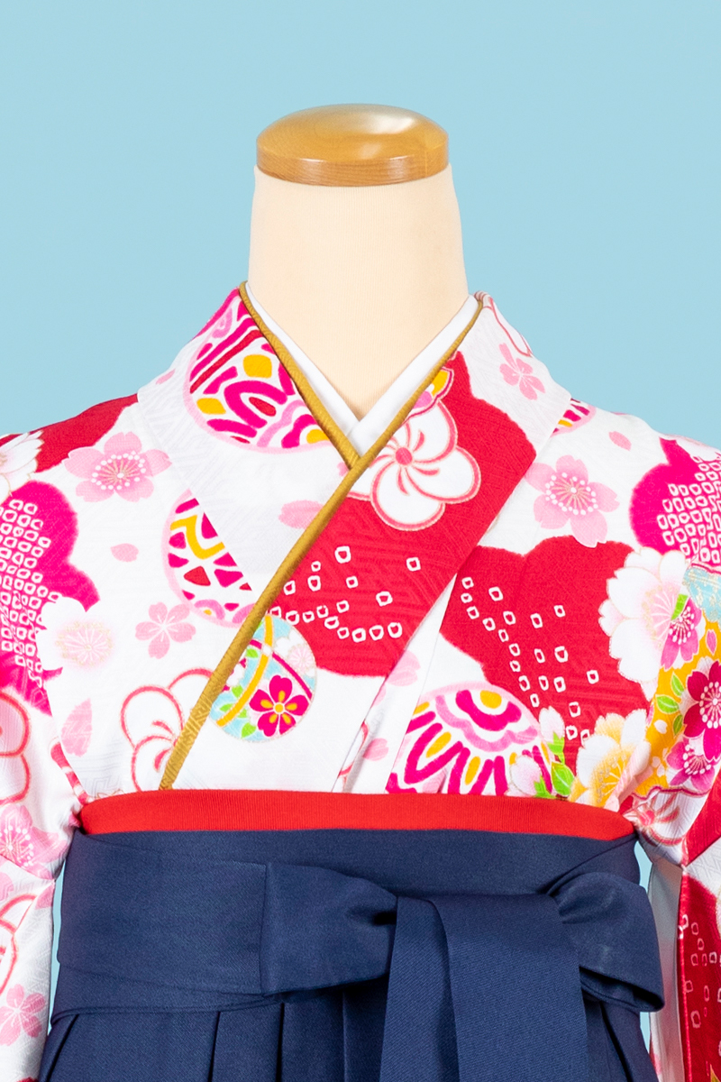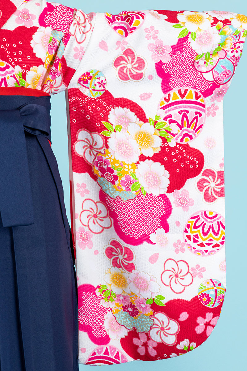 白×赤が晴れの日にふさわしい一枚。レトロモダンが珍しい袴スタイルです。