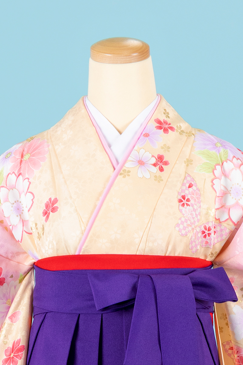 パステル黄色の淡い色合いの袴。芍薬の花や蝶を配したパステルカラーが見事な一枚。