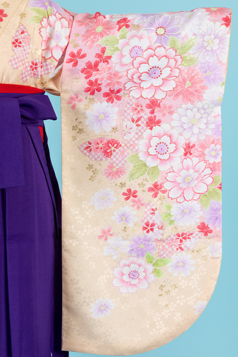 大きな花々と市松模様をあしらった蝶がとってもドリーミィ。大人っぽさも兼ね備え、欲張りな乙女心は大満足。【TSH-18と二尺振袖が同じ/TSH-14・18と色違い】。