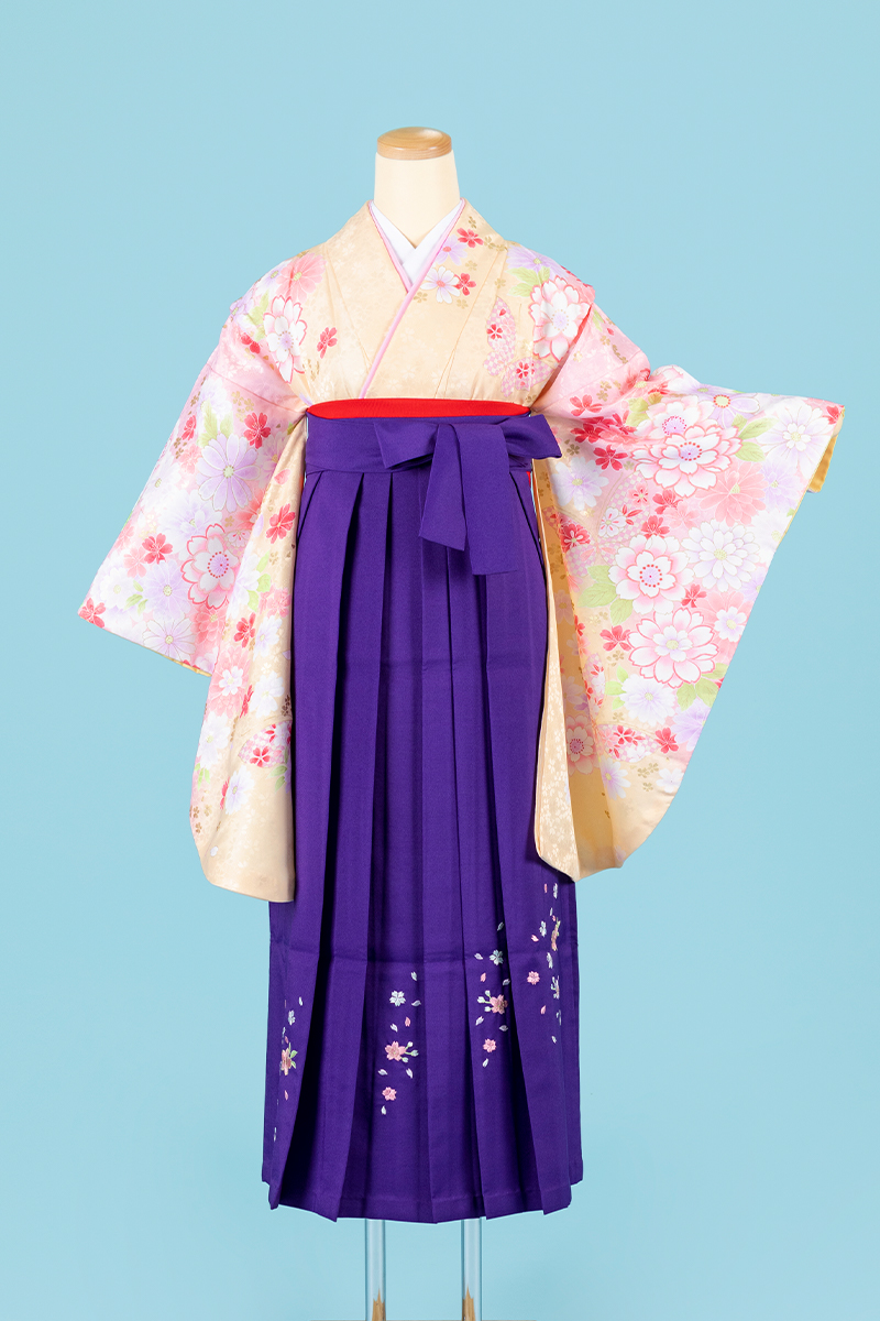 二尺振袖(比翼付)・袴・半巾帯・長襦袢・巾着・草履・着付け小物