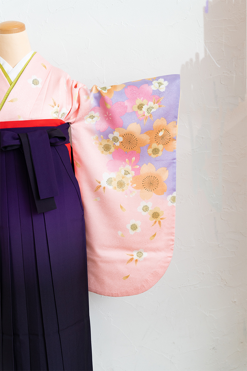 ぼかし風の桜の色合いにふんわりとした紫色が配色され、ガーリーテイストの袴セットです。紫の袴で上品さもプラスされ、オススメです!