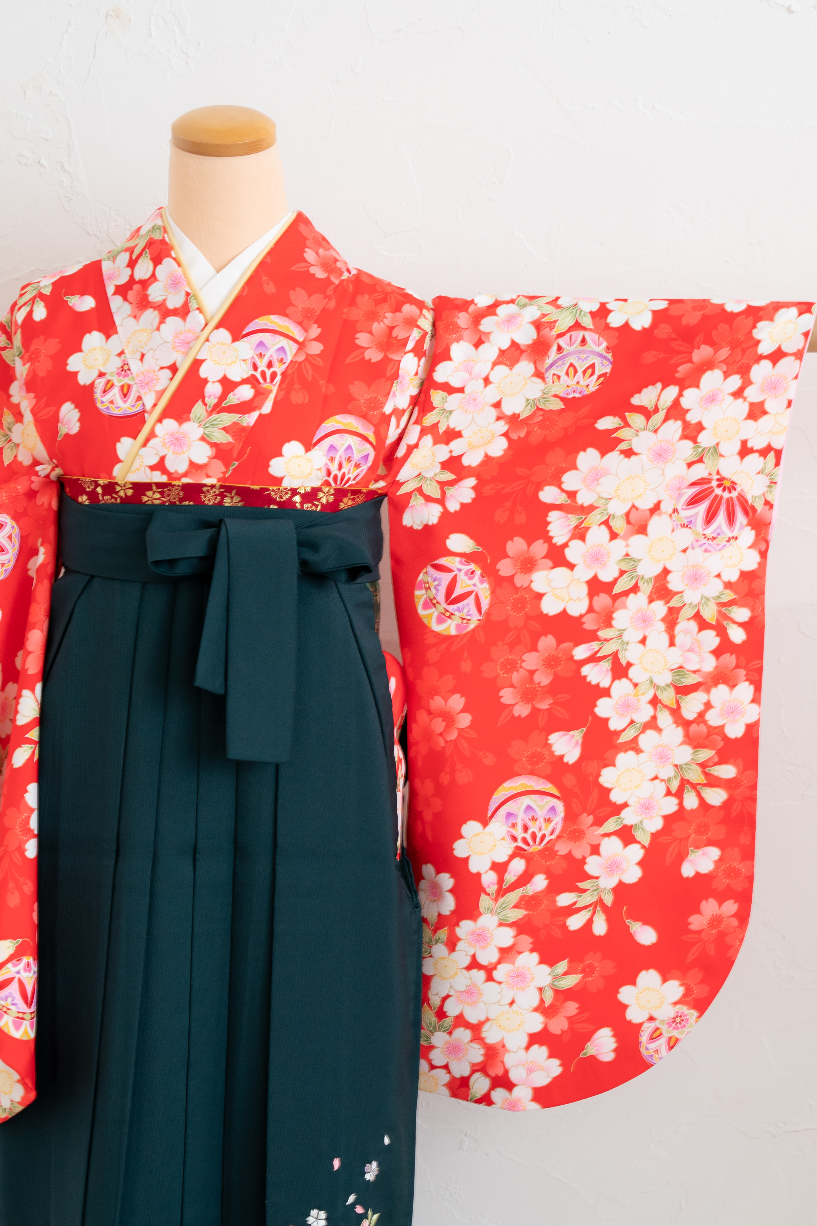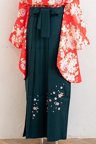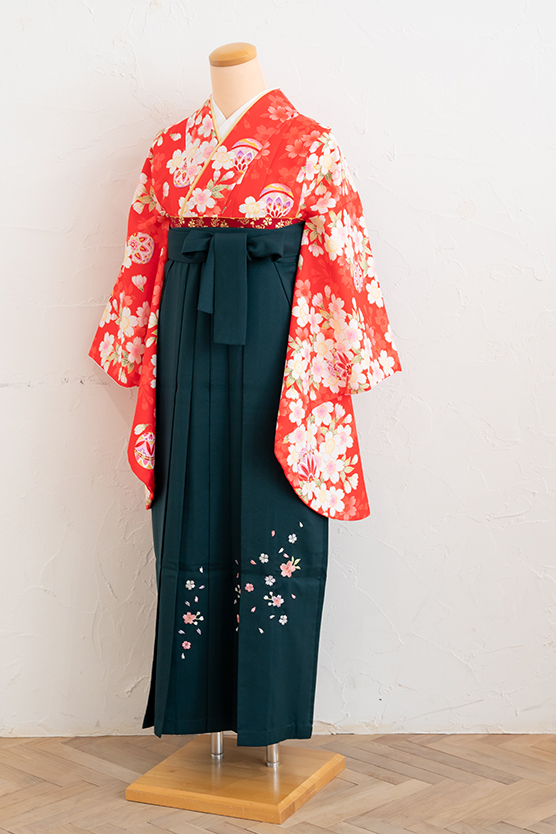 弾む毬に心浮き立ち、花が舞う柄は晴の日にピッタリのスタイルです。刺繍入りの深緑の袴を合わせて上品に。