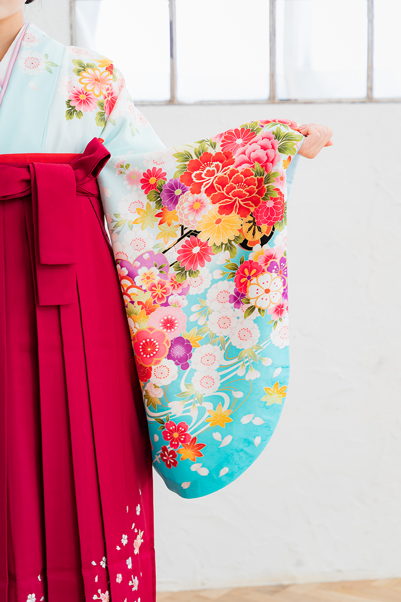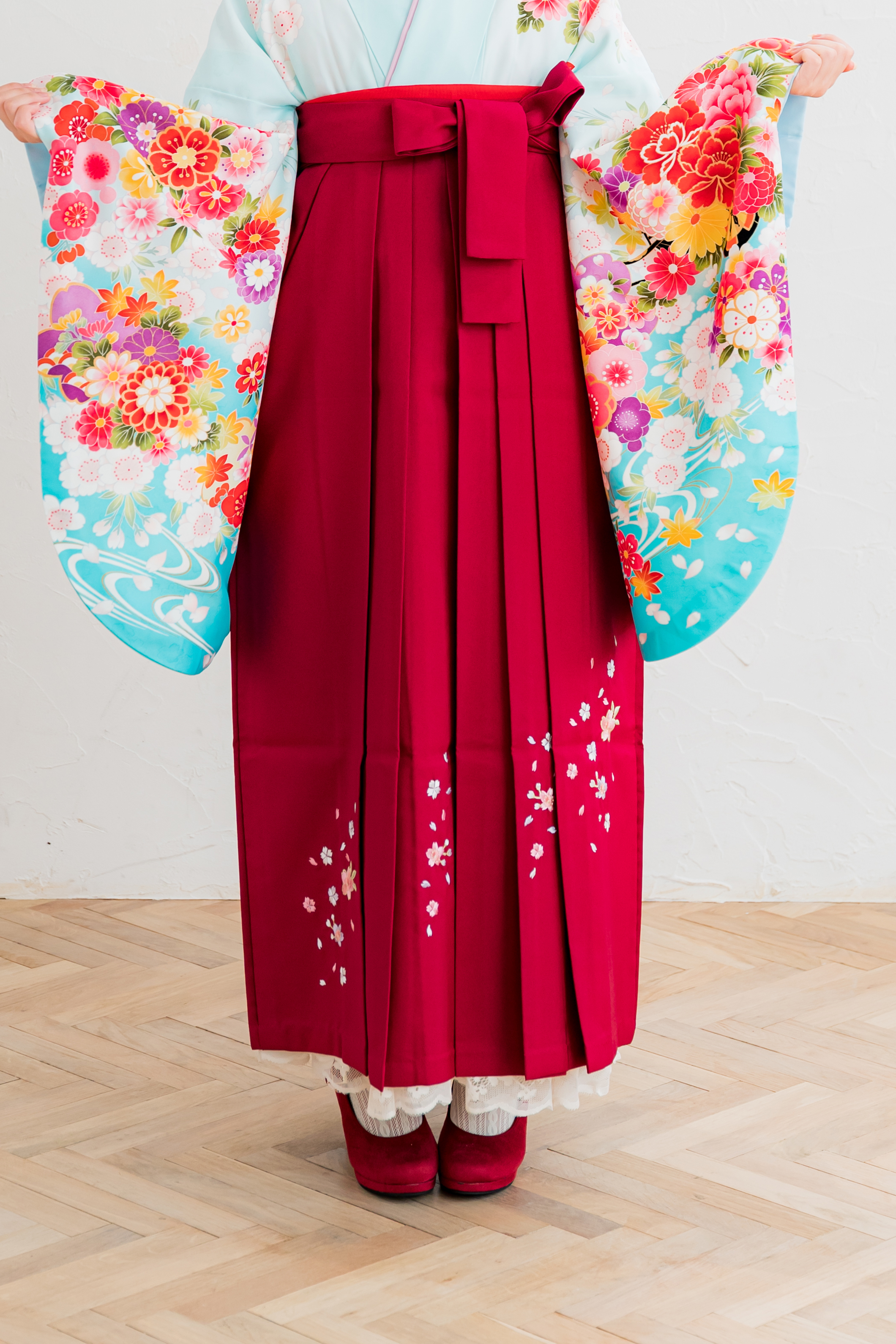 二尺振袖(比翼付)・袴・半巾帯・長襦袢・巾着・草履・着付け小物