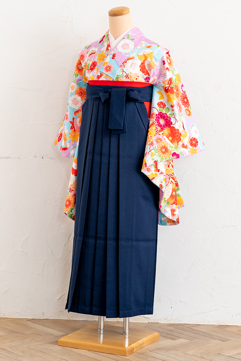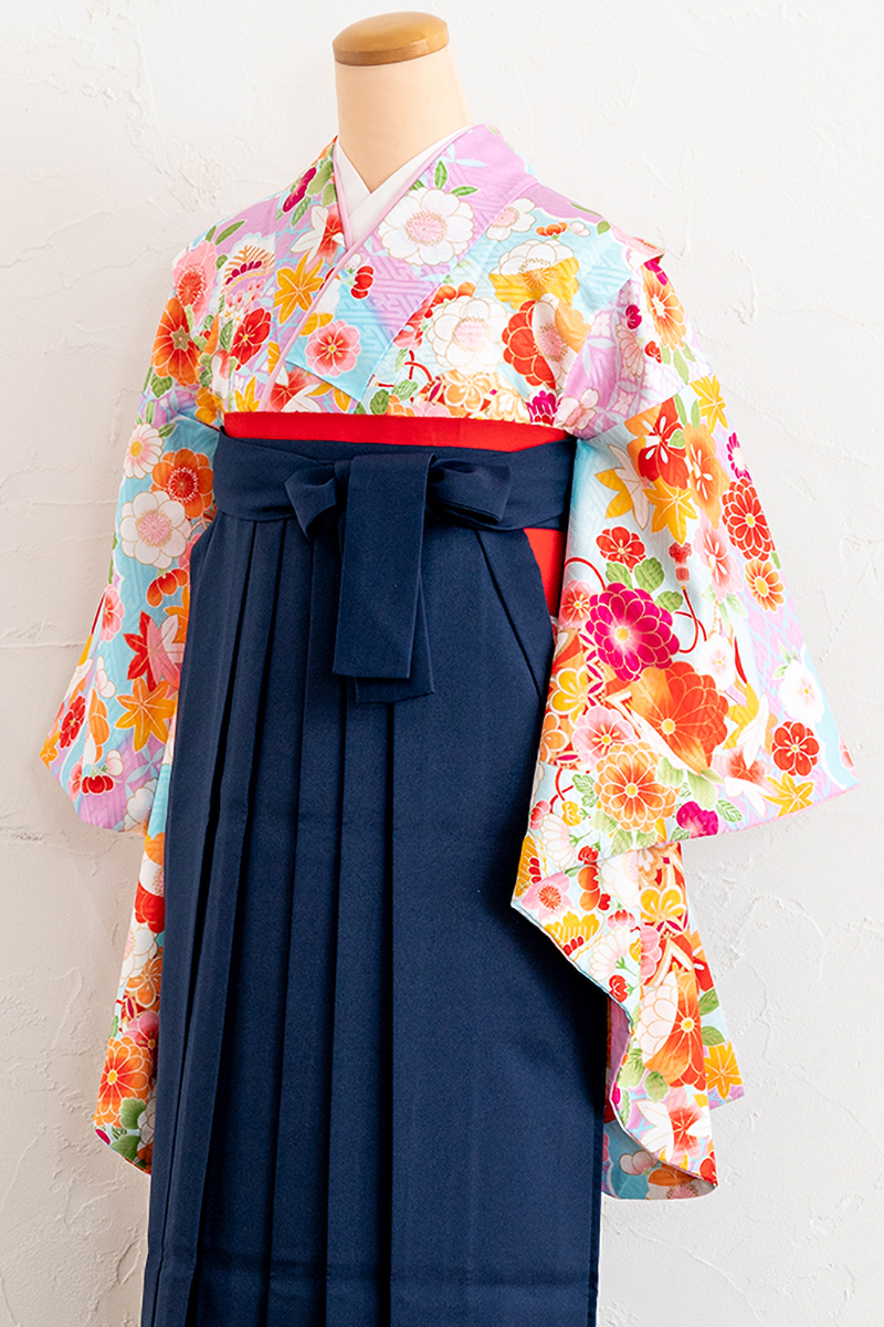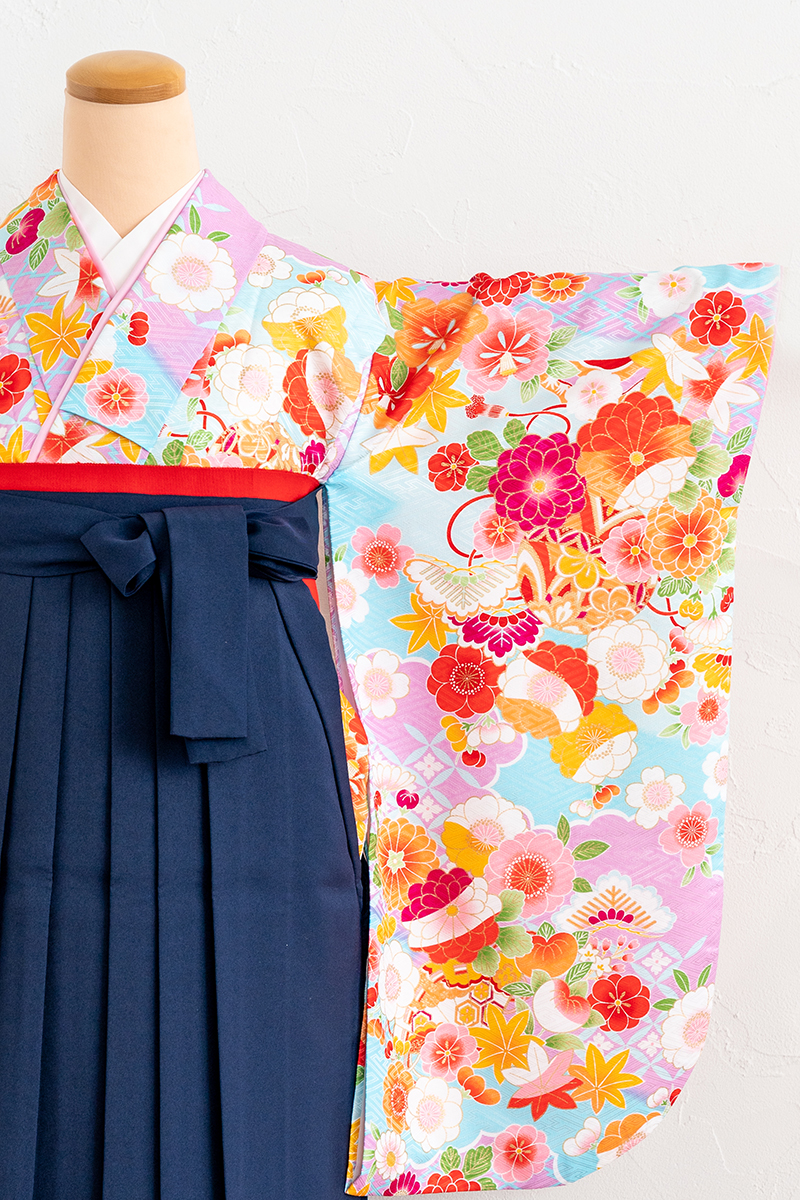 淡い薄ムラサキ色に花々が舞うように広がり、吉祥紋が散りばめられた一枚です。学生らしい紺色の袴をあわせて、卒業式を迎えよう。