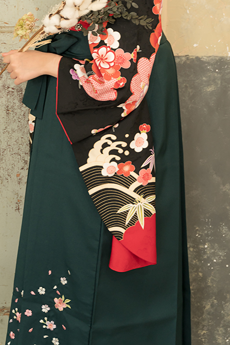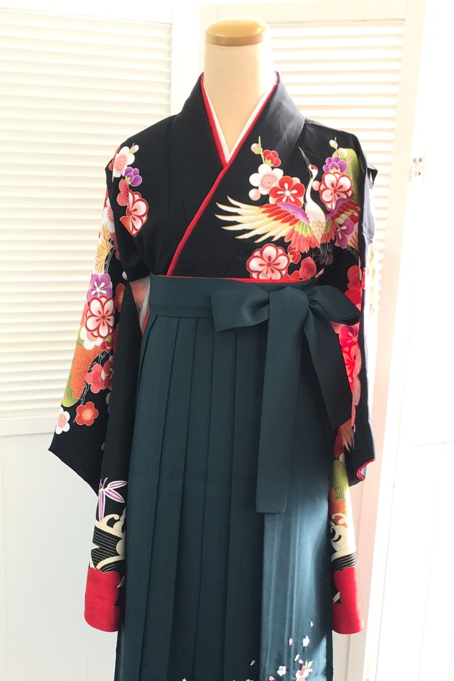 黒ベースに赤のポイントカラーが際立つ袴スタイル。松竹梅や鶴が描かれ、門出に相応しい袴スタイルです。