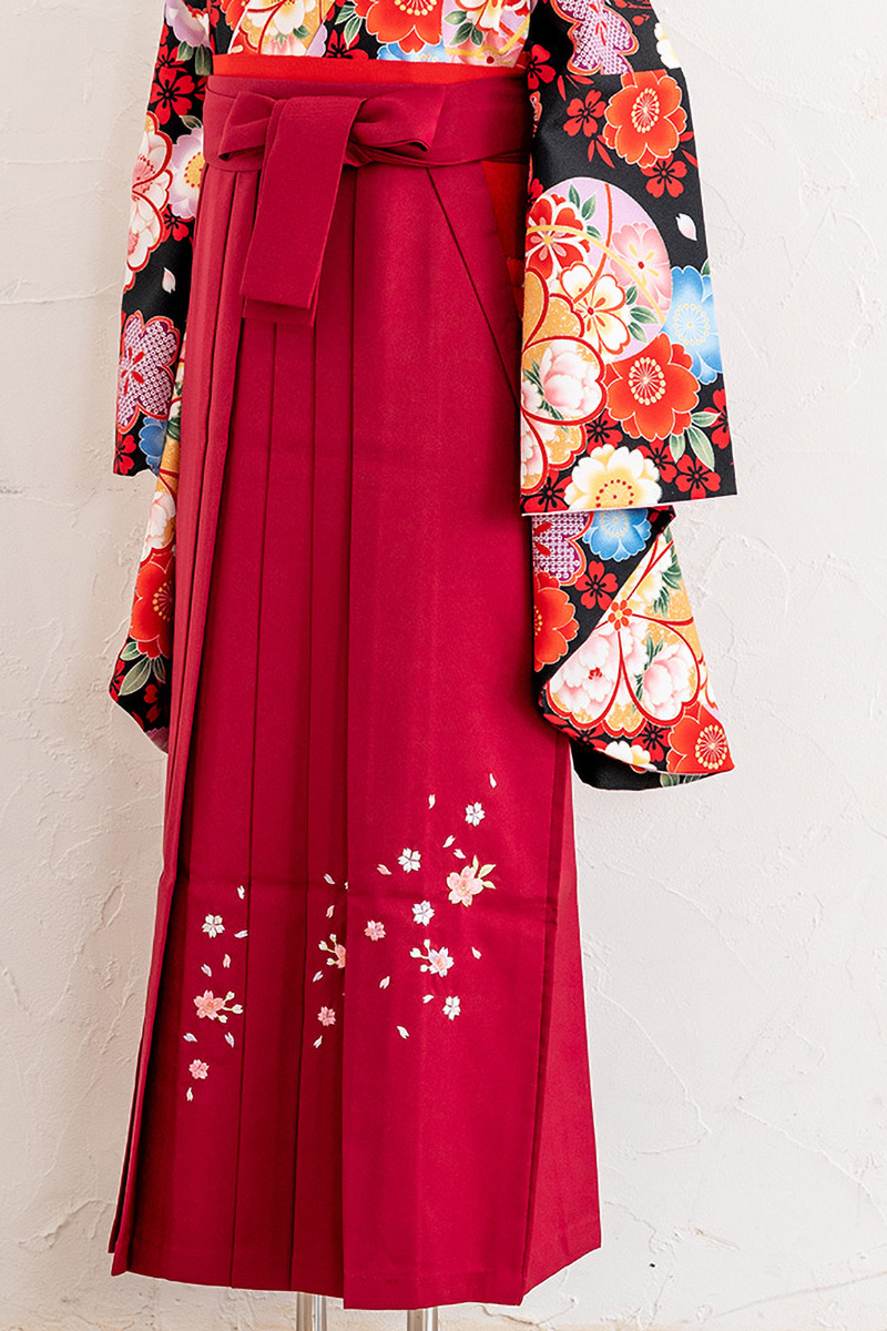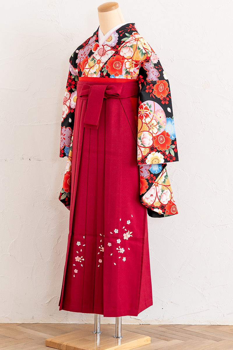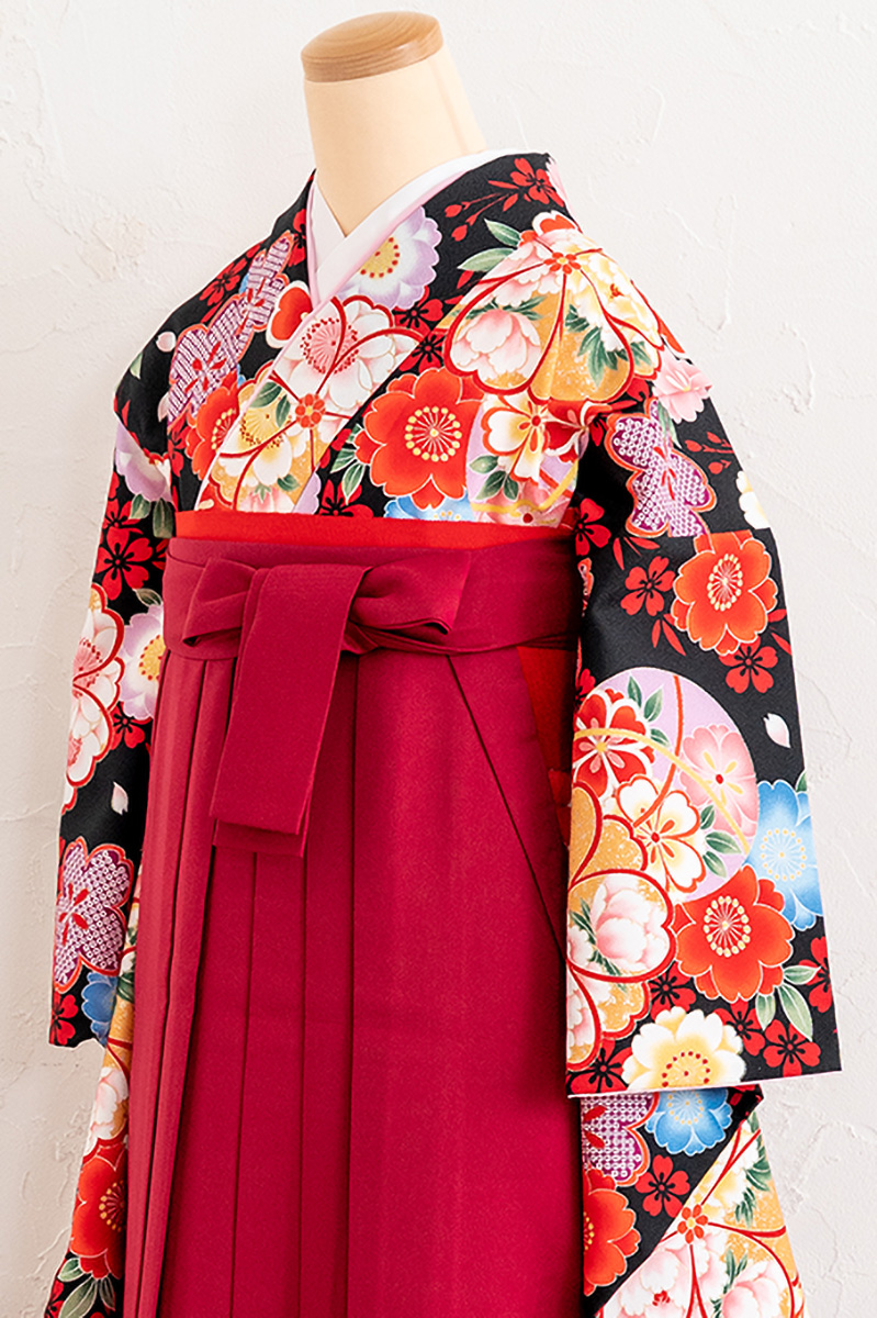 胸元に色とりどりの花をあしらい、夜桜が舞うような幻想的な雰囲気。豪華なブーケのようで、卒業式の祝福ムードを盛り上げる一枚です。