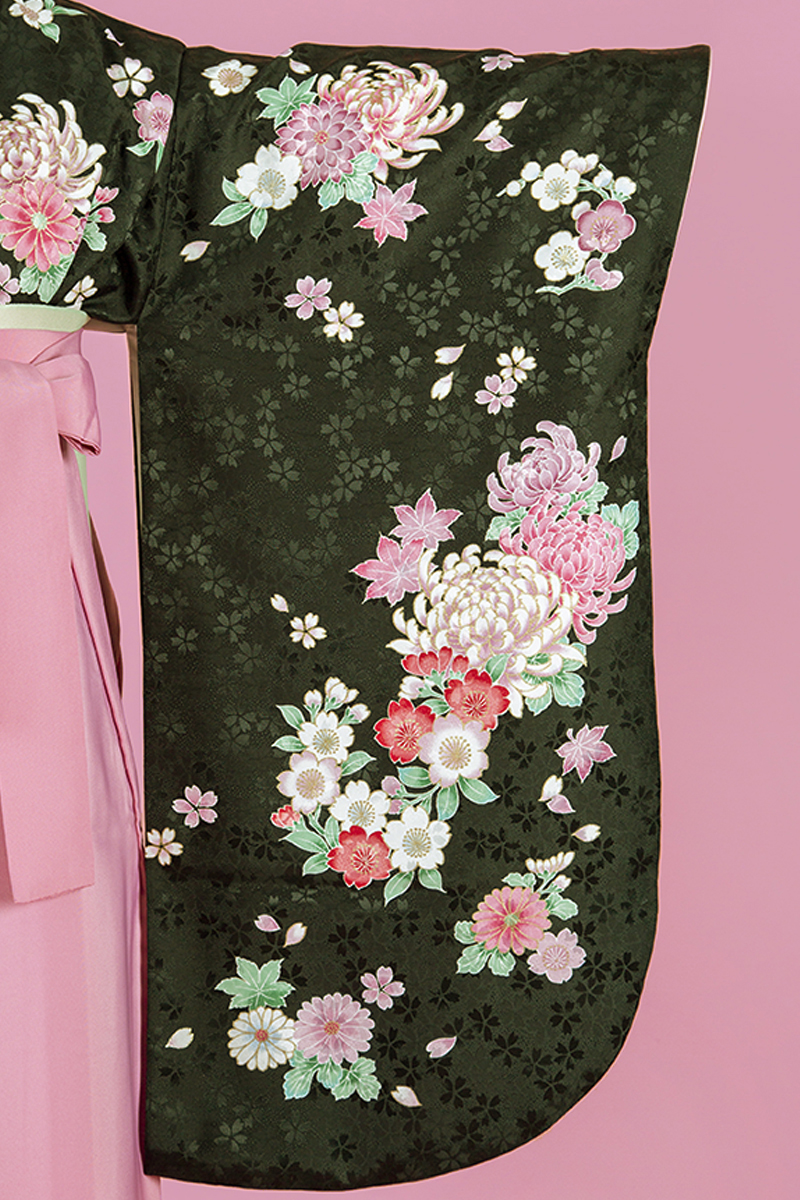 黒地に桜の地紋入り、さらに色とりどりの花が全面に入り、とってもゴージャス!ピンクの袴で可愛さUP!!