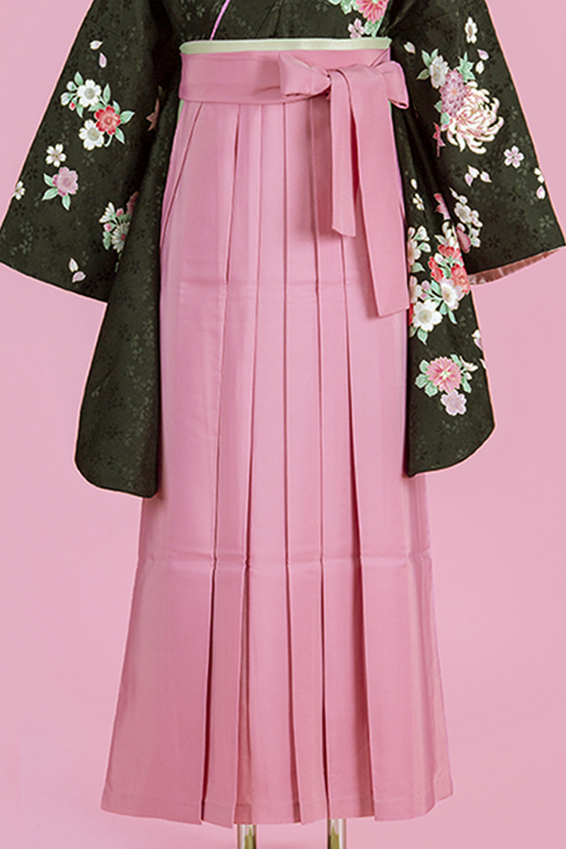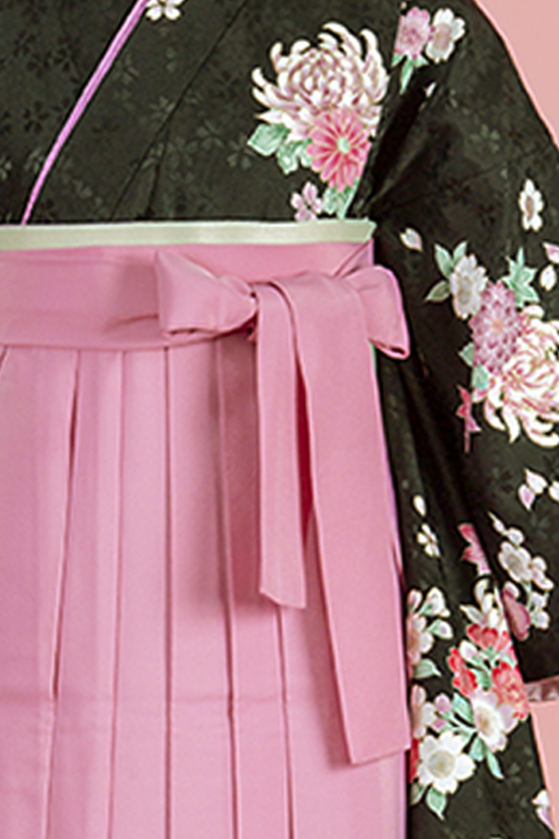 ピンクの袴は乙女をくすぐる逸品。黒地を合わせることで甘くなりすぎない甘辛MIXコーデになっています。