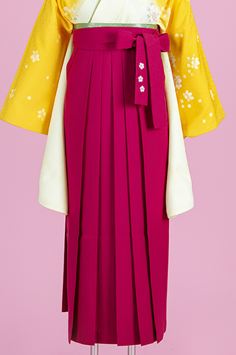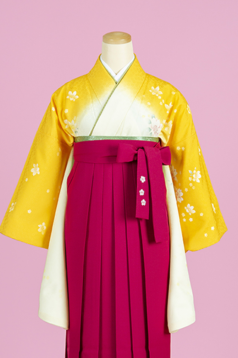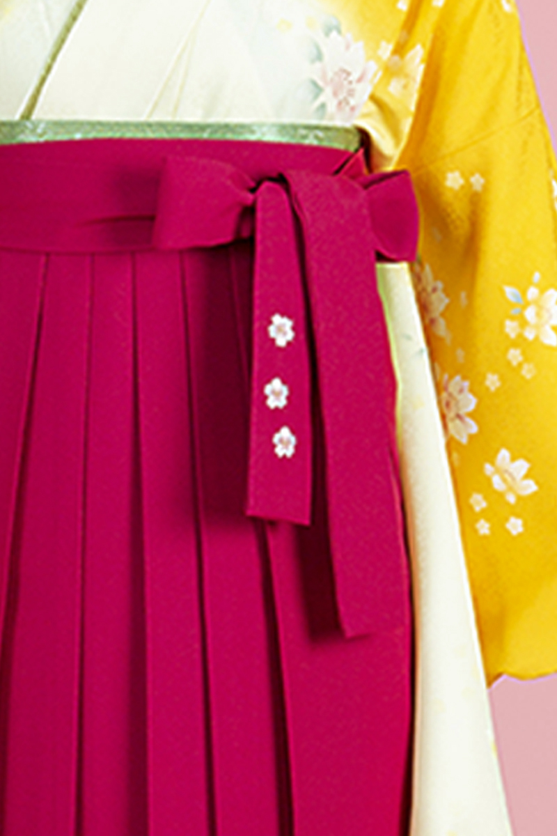 春らしい綺麗な黄色のグラデーション柄に、袴にも花柄刺繍で春にぴったりの商品です♪黄色がパっと目をひき、マゼンダ(ピンク)の袴が女の子らしさをより一層引き立てます。