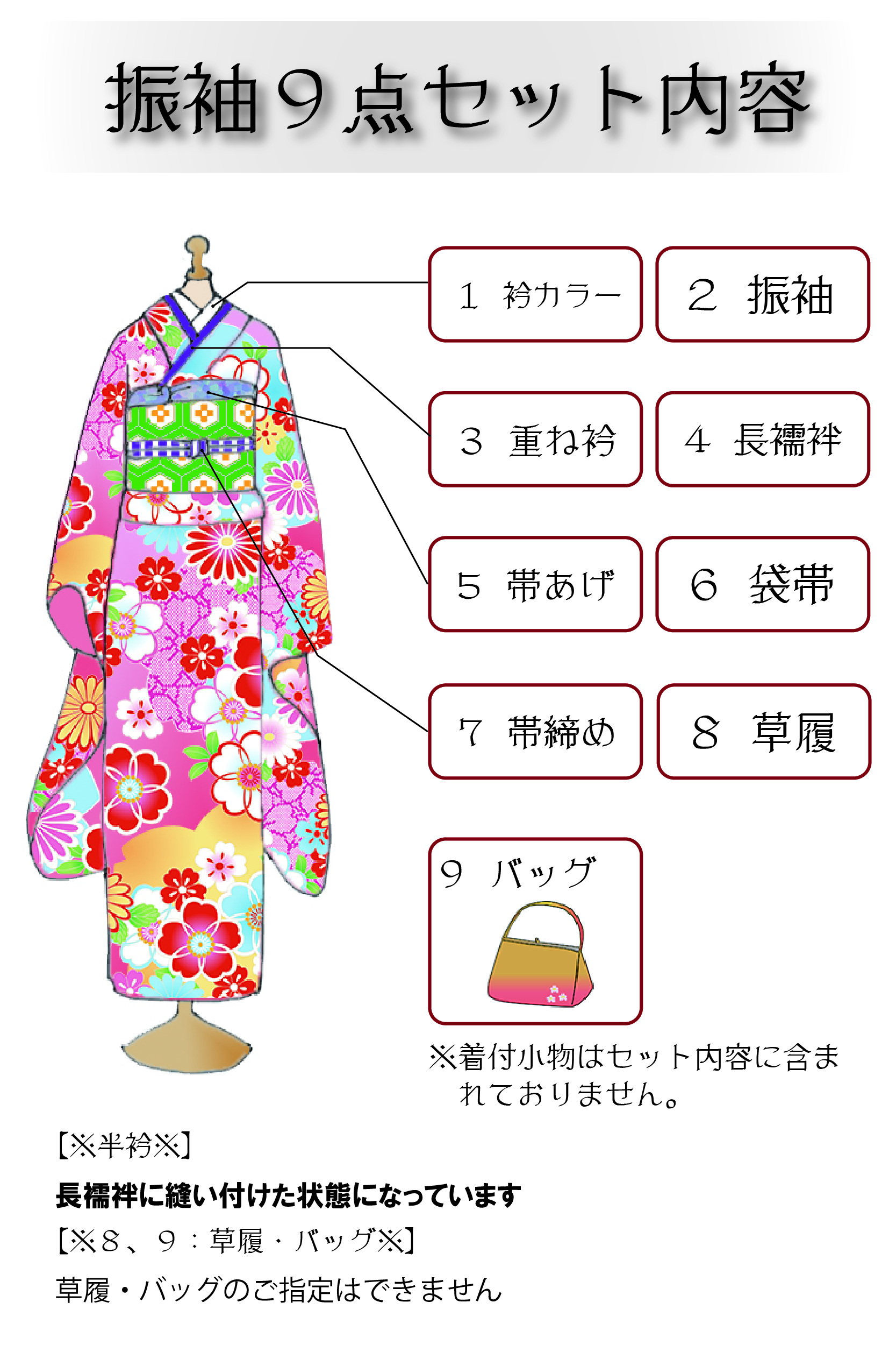 振袖・袋帯・長襦袢・半衿・帯締め・帯あげ・重ね衿・草履・バッグ ※草履・バッグの色柄はご指定いただけません。